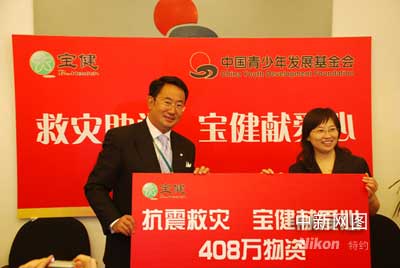 災(zāi)難發(fā)生后,寶健是第一家積極響應(yīng)中國(guó)青少年發(fā)展基金會(huì)號(hào)召進(jìn)行抗震救災(zāi)助學(xué)捐款的公司。截止目前,寶健公司通過(guò)與中國(guó)青基會(huì)共同設(shè)立的“寶健自主基金”,向?yàn)?zāi)區(qū)累計(jì)捐贈(zèng)的?睢⑽镔Y已超過(guò)800萬(wàn)元人民幣,這些款項(xiàng)和物資將主要用于支持希望工程、支持學(xué)生救助和學(xué)校重建,并向?yàn)?zāi)區(qū)同胞提供所需要的一些恢復(fù)體能、提高抵抗力的健康食品等賑災(zāi)工作。