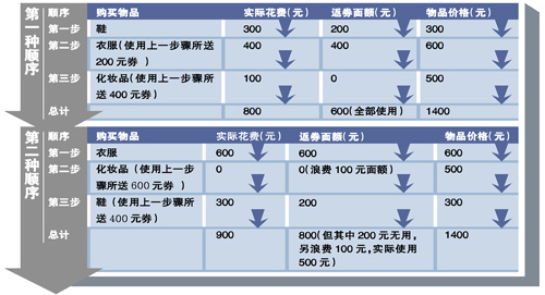 當(dāng)然,最劃算的模式是買一個200元的東西,再加購一個100元的東西。但實際上,剛好買成這樣的幾率不大。比如,張小姐買一條褲子花了299元,返券100元;然后使用返券購買一件149元的T恤衫,這樣實際支出是348元購買了價值448的東西,折扣為348/448 =7.77折。