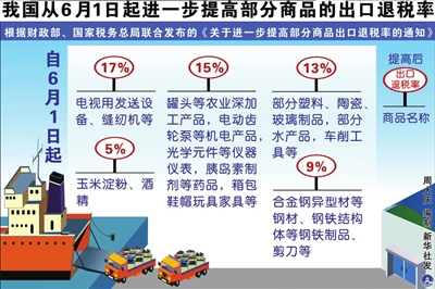 經(jīng)國(guó)務(wù)院批準(zhǔn),財(cái)政部和國(guó)家稅務(wù)總局昨天聯(lián)合發(fā)布通知,宣布從6月1日起再度提高部分商品的出口退稅率,此次調(diào)整涉及農(nóng)產(chǎn)品深加工、機(jī)電、鞋帽、玻璃制品、鋼鐵制品等制造業(yè)領(lǐng)域超過(guò)2600個(gè)稅目的商品。