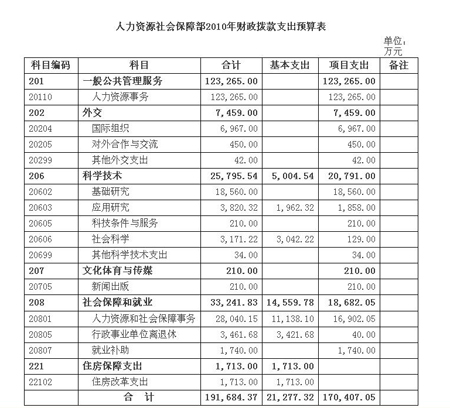 據(jù)人社部網(wǎng)站消息顯示,根據(jù)《財政部關(guān)于批復(fù)人力資源和社會保障部2010年部門預(yù)算的通知》(財預(yù)[2010]205號),人社部2010年預(yù)算情況如下: