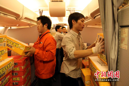 此次運(yùn)輸貨物的飛機(jī)是沒(méi)有旅客的客機(jī),因?yàn)槲鲗師o(wú)法降落大型貨機(jī),南航只能以 客機(jī)載貨。該批物資是廣東省府捐贈(zèng)給玉樹地震災(zāi)區(qū)的餅干、快食面等食品,共90357箱,總重量為38噸。因?yàn)轱w機(jī)容量有限,該批物資分兩批承運(yùn),當(dāng)晚首批裝載20.81噸。