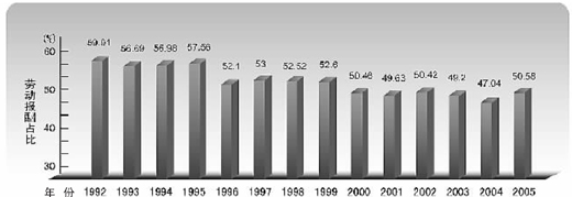 從國際口徑統(tǒng)計(jì)結(jié)果看,我國勞動報酬占比的基本走勢和國內(nèi)口徑統(tǒng)計(jì)相一致,但差距縮小。從1992年到2005年,除了2003年、2004年低于50%外,其他年份勞動報酬占比均在50%以上。