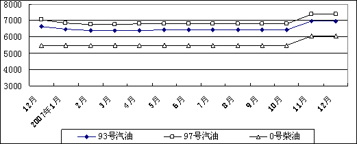 12月份,成品油供應(yīng)緊張局面有所緩解,市場價(jià)格保持基本平穩(wěn)。36個(gè)大中城市加油站90號(hào)、93號(hào)、97號(hào)汽油和0號(hào)柴油實(shí)際零售價(jià)格分別為每噸6569元、6985元、7384和6039元,均與上月基本持平。
