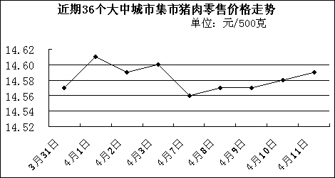 中新網(wǎng)4月14日電 中國(guó)國(guó)家發(fā)改委網(wǎng)站消息,據(jù)發(fā)改委價(jià)格監(jiān)測(cè)中心監(jiān)測(cè),上周(4.7-4.11,下同)全國(guó)36個(gè)大中城市集市豬肉(精瘦肉)平均零售價(jià)格每500克為14.57元,比前一周(3.31-4.4,下同)下降0.14%。