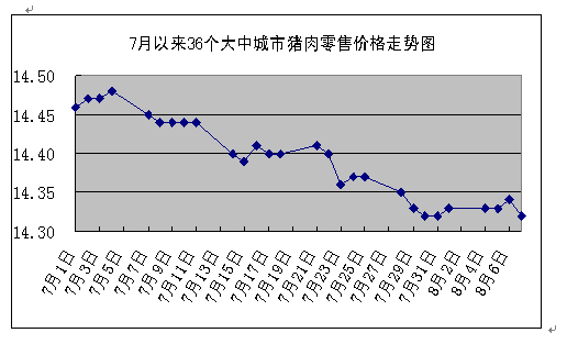 中新網(wǎng)8月11日電 據(jù)國(guó)家發(fā)改委網(wǎng)站消息,發(fā)改委價(jià)格監(jiān)測(cè)中心監(jiān)測(cè)顯示,上周(8月4日~8月7日)全國(guó)36個(gè)大中城市集市、超市豬肉(精瘦肉)平均零售價(jià)格每500克為14.33元,與前一周(7月28日~8月1日,下同)持平。
