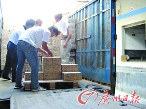 搬運(yùn)工人正在將查處的假冒產(chǎn)品搬運(yùn)上車。