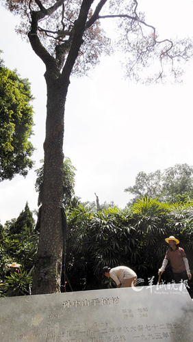 黃花崗公園中潘達微烈士墓側(cè),有一株高約20多米的馬尾松,高大挺拔,冠如羅傘。樹前有一銘牌,標(biāo)示此樹為孫中山先生親手所植。