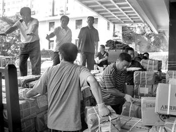 工作人員正在向災(zāi)區(qū)發(fā)運教材。 本報記者 王立強 攝