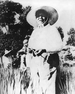 這是毛澤東一生第一次,也是唯一一次來到成都。23年前即遵義會議后,他曾進入四川,帶領中央紅軍飛奪瀘定橋,然后進阿壩高原,爬雪山,過草地,歷盡艱險,而今他站在成都西門遠眺隱約可見的雪山,可能不僅想到了杜甫的著名詩句,更多想到的應是自己曾經(jīng)出沒那里的曲折經(jīng)歷。