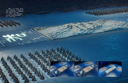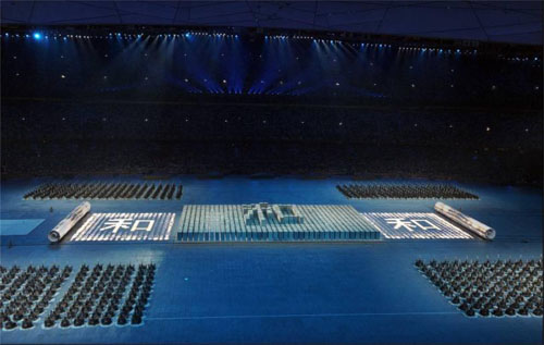 2008年北京奧運(yùn)會(huì)開幕式上,幾百名演員扮演的活字印刷字模通過不斷變幻,用大篆、小篆、楷書三種不同字體展現(xiàn)了同一個(gè)漢字——“和”。
