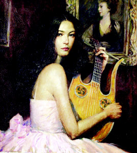 當華人社區(qū)對這位“英雄”贊不絕口時,徐純中也成了最受好萊塢明星歡迎的畫家。畫冊中一幅《甜蜜的琴聲》正是當紅女星凱瑟琳.澤塔.瓊斯的肖像畫。據(jù)徐純中回憶,澤塔.瓊斯當時特地從好萊塢借了一把十分名貴的古琴,還選了一件粉色衣服,來突出自己象牙白的膚色。不過,性格活潑的澤塔.瓊斯每次坐不到十分鐘,就要起身吃東西、接電話,或者吩咐仆人做什么事。徐純中笑說,“過了3個半小時,我還沒有畫完,澤塔.瓊斯有些不耐煩了。于是,我只能帶著未完成的初稿回去上色。作品完成后,她對我的作品非常滿意,并與我相約每隔兩年,為她畫一次肖像,現(xiàn)在我已經(jīng)著手第三幅了!