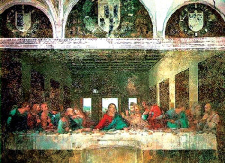 《最后的晚餐》是達(dá)·芬奇的代表作。作品題材取自圣經(jīng)故事:叛徒猶大告密,基督在即將被捕和釘死在十字架前,與十二門徒共進(jìn)晚餐,席間基督鎮(zhèn)定地說(shuō)出了有人出賣他的消息,此話引起眾弟子的騷動(dòng),每個(gè)人都對(duì)這句話做出了富有個(gè)性的反應(yīng),有的向耶穌表白自己的忠誠(chéng);有的義憤填膺要求追查;有的大惑不解詢問(wèn)究竟。達(dá)·芬奇此作就是基督說(shuō)出這一句話時(shí)的情景。