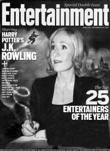 《娛樂周刊》按照一個班級里可能會出現(xiàn)的5種人來為娛樂界的名人定位,他們分別是天賦異稟、班中小丑、風(fēng)云達(dá)人、八卦之星和致詞代表。今年推出《哈利.波特》完結(jié)篇的羅琳沒被歸于其中任何一類,被選為“年度娛樂人物”。雜志認(rèn)為,羅琳完成了不可能完成的任務(wù),在電玩和在線游戲充斥、一切講究短小輕薄的年代,她施展魔法,讓數(shù)億大小孩抱著厚厚的印刷書籍愛不釋手,雜志如此評價說:“《哈利.波特》已賣出了4億冊,并且拍成了有史以來最賺錢的電影系列片,羅琳讓人們圍著她老式的印刷大書團(tuán)團(tuán)轉(zhuǎn),好像這就是地球上最火熱的新娛樂手段似的!