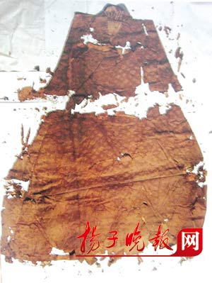 照片中,一堆已經(jīng)損壞的咖啡色織物,殘缺不全、圖案斷續(xù)、毫無光澤,就好像枯萎的花朵一般。如果不是專家介紹,沒有人會將它們和明代皇帝、云錦聯(lián)系在一起。這件“中單”出土于萬歷帝棺內(nèi)中部中間,剛剛出土?xí)r,是金光閃閃的,但是在與空氣接觸后,迅速氧化、褪色。通過云錦研究所的復(fù)制,記者見識了“紅八寶四合云紋綢交領(lǐng)中單”當(dāng)年的風(fēng)采,“中單”無袖,里與面之間夾了一層薄棉絮,凸于表面的紋樣是象征“物華天寶”的八寶紋。據(jù)介紹,此件“中單”類似于現(xiàn)代的襯衫,“小衣之外、大衣之中”,尺寸一般小于袞服、龍袍一寸,長四尺。