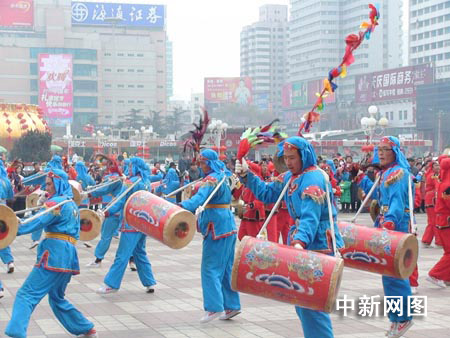 中新網(wǎng)蘭州2月10日電(聶娟)一年一度的蘭州春節(jié)文化廟會(huì)今日此間又是游人如織,熱鬧非凡。今天上午,東方紅廣場體育館前開始了“蘭州市精品社火爭霸賽”,來自蘭州城關(guān)區(qū)的威風(fēng)鑼敲響了歡慶的鑼鼓,祥和喜慶的節(jié)日氣氛,吸引了眾多正在出游的市民。