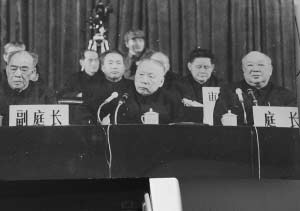 1980年伍修權(quán)(前排中)在法庭上穿著制服審判時(shí)的情景。