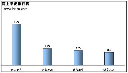 而祭祀的對(duì)象,最高的是親人朋友,占到了48%。其次是烈士英雄、遠(yuǎn)古祖先和明星藝人,分別占20%、17%、15%。