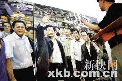 昨日,記者在作畫(huà)現(xiàn)場(chǎng)看到很多熟悉的畫(huà)面,有《敬禮娃娃》、《握筆的手》……而在《地劫·重生》長(zhǎng)卷上還驚喜地發(fā)現(xiàn),有一組創(chuàng)作正是取材于本報(bào)特派四川記者李潔軍、王小明的一幅攝影作品,該新聞圖片攝于5月16日上午,畫(huà)面凝固的是當(dāng)時(shí)胡錦濤總書(shū)記來(lái)到四川地震災(zāi)區(qū)北川羌族自治縣,向當(dāng)?shù)厝罕姾蛽岆U(xiǎn)武警官兵揮手慰問(wèn)的瞬間。 (記者 陳琦鈿 實(shí)習(xí)生 李淑子)