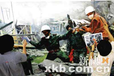 “而我認(rèn)為,這次是賑災(zāi)作畫(huà),大家應(yīng)該用愛(ài)心去畫(huà),而不是去強(qiáng)調(diào)每個(gè)人的繪畫(huà)個(gè)性。只要你愿意做,藝術(shù)風(fēng)格是可以磨合的,當(dāng)然這需要一股非常強(qiáng)大的推動(dòng)力去促使大家這么做……”陳鏗用了整整一個(gè)晚上,把1千多張發(fā)自災(zāi)區(qū)的圖片報(bào)道翻了個(gè)遍,之后從中選擇出幾十張非常具有代表意義的“瞬間”,重新組合成三組震撼人心的畫(huà)面,《地劫》、《拯救》、《重生》。