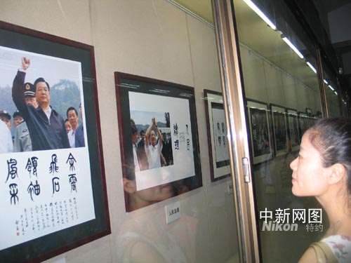 記者今天在開幕式現(xiàn)場看到,作品主要為篆書,每幅配以背景圖片,災(zāi)區(qū)人民的苦難、人民總理奔走廢墟之中的身影、殘?jiān)珨啾陂g不懈抗?fàn)幍纳、救援官兵不拋棄不放棄的努力……一個(gè)個(gè)場景、一個(gè)個(gè)片段、一個(gè)個(gè)故事,充滿了震撼人心的力量。
