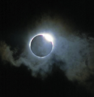 其次是日冕,當(dāng)貝利珠消失,月亮把太陽(yáng)安全擋住,立即可以在黑太陽(yáng)圓面的邊緣看到了一圈紅色的色球?qū),有時(shí)還能看到從色球?qū)訃姲l(fā)出的白色日珥;隨即色球?qū)右脖辉铝琳谧,平時(shí)看不到的太陽(yáng)外層大氣———日冕就露出了“尊容”,它那呈現(xiàn)放射開(kāi)頭的珍珠色光芒,好像給太陽(yáng)戴上了一頂帽子。此時(shí),在黑暗的天空中,往往還能看到金星和木星等行星,以及其他明亮的恒星。