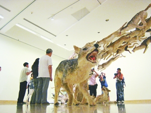本報訊 作為北京奧運會開幕式特效設計總監(jiān),藝術(shù)家蔡國強參與創(chuàng)作的開幕式焰火表演已經(jīng)讓全世界的觀眾驚訝,而昨天在中國美術(shù)館開幕的他的個人作品回顧展,則展示了他更為豐富的創(chuàng)作面貌:插滿羽箭的古船懸掛在觀眾頭頂,翻滾的汽車在展廳中閃耀,而99匹狼更是讓小朋友驚呼“狼來了”。