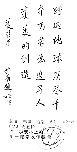 昨日,艾青妻子看到“金兆拍賣圖錄”復(fù)印件中艾青的書法作品后告訴本報(bào),這幅作品可以百分之百肯定為假的,“從哪方面來(lái)說(shuō)都是假的,艾青和季羨林沒(méi)什么交往,從字跡來(lái)說(shuō)是假的,從年代上來(lái)說(shuō)也不可能。”