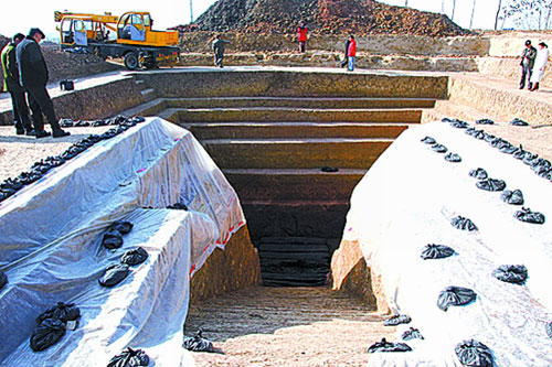 最大古墓發(fā)掘現(xiàn)場(chǎng),厚厚的土層已被分成了7級(jí)收縮臺(tái)階。據(jù)介紹,這個(gè)大墓地下部分深達(dá)7米多,外開(kāi)口占地面積達(dá)52平方米,墓道面積達(dá)22平方米。記者發(fā)現(xiàn),大墓最后3級(jí)臺(tái)階下,土層由黃變赭紅。專家稱,赭紅色土層其實(shí)不是真正的土層,而是尚未完全形成的紅砂巖,遇水比較軟,但風(fēng)干后就成了風(fēng)化石。因此可以想象,當(dāng)年修墓時(shí),棺槨下部的空間是由人工開(kāi)鑿出來(lái)的,四壁上仍能看到明顯的開(kāi)鑿痕跡。