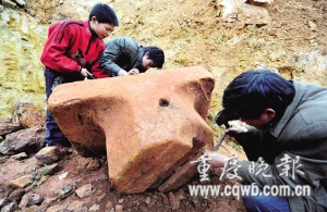 幾個(gè)身強(qiáng)力壯的村民彎下腰,雙手摳住金屬體一起發(fā)力,試圖撼動(dòng),但金屬體紋絲不動(dòng)。聞?dòng)嵡巴F(xiàn)場(chǎng)查看的綦江縣文管所所長(zhǎng)周鈴依據(jù)鐵的密度計(jì)算,發(fā)現(xiàn)這座金屬體重量近4噸。