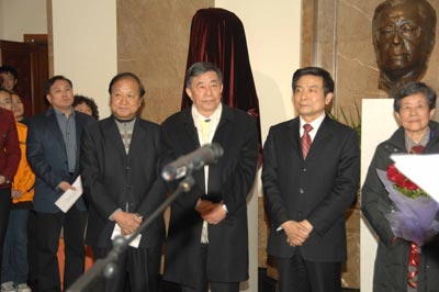 北京市委常委、宣傳部長、副市長蔡赴朝,老舍先生的子女舒乙先生、舒濟(jì)女士和舒雨女士,以及參加國際老舍研討會的一百八十余位專家學(xué)者,北京人藝全體院領(lǐng)導(dǎo)和各部門代表,當(dāng)年《龍須溝》首演陣容的演員代表鄭榕、李濱、舞美設(shè)計(jì)宋垠、韓西宇等,于是之先生的夫人李曼宜女士,新版《龍須溝》劇組代表顧威導(dǎo)演,老舍頭像作者、中央美術(shù)學(xué)院教授、雕塑藝術(shù)家孫家缽等出席了揭幕儀式。當(dāng)晚7時許,蔡赴朝和舒乙一起,共同為老舍先生雕塑揭幕。至此,中國近代文學(xué)史上的三位大師——老舍、焦菊隱、曹禺的銅像共同屹立、“聚首”在首都劇場大廳內(nèi),供后輩瞻仰!
