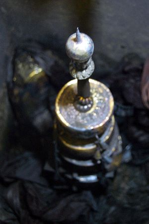 考古學(xué)家已經(jīng)論定,這座塔的制造地在揚(yáng)州,制造時(shí)間為宋真宗大中祥符四年。但是疑惑又來(lái)了,如此高規(guī)格的七寶阿育王塔究竟是民間奉養(yǎng)還是皇家供奉?據(jù)悉,宋真宗祥符年間,長(zhǎng)干寺地下的佛祖舍利常常顯靈。為此,真宗敕命重新整修長(zhǎng)干名寺,并在寺內(nèi)放置9層“圣感舍利塔”。就此論證,七寶阿育王塔具有皇家供奉的特點(diǎn),但是出土的實(shí)際情況卻大異其趣。因?yàn)閺蔫F函內(nèi)發(fā)現(xiàn)的文字看,供奉者卻是來(lái)自民間,供奉人的名字都是稀松平常的“三哥”、“四郎”、“大娘”等。而且,在塔基上還發(fā)現(xiàn)了“皇帝萬(wàn)歲”等字,更說(shuō)明這座七寶阿育王塔的民間屬性。
