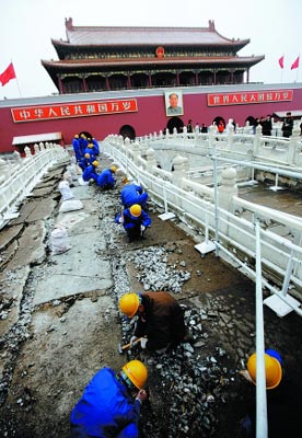 為迎接新中國(guó)成立60周年,天安門金水橋從昨日起開始修繕。天安門管委會(huì)昨日消息稱,此項(xiàng)工程預(yù)計(jì)在5月1日前完工。來自北京市文物局官網(wǎng)的招標(biāo)公告顯示,工程財(cái)政撥款資金94.64萬元。