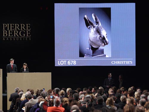 2008年10月下旬,本網(wǎng)記者從從“國寶工程·中華搶救流失海外文物專項基金”獲悉,佳士得宣布將于2009年2月23日至25日在法國巴黎舉辦“伊夫·圣羅蘭與皮埃爾·貝杰珍藏”專場拍賣,拍品中包括1860年英法聯(lián)軍自圓明園掠走、流失海外輾轉多年的鼠首和兔首銅像,拍賣估價均為800萬至1千萬歐元,總價高達人民幣2億元。