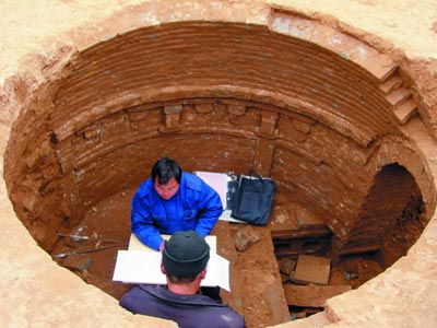 記者看到,在一個(gè)方坑內(nèi),有一座青磚壘砌的精美古墓已經(jīng)顯露出來。只見這個(gè)古墓有墓道、墓門和墓室。墓門呈拱形,高約1.6米,造型非常精致。墓室是圓形,頂部呈穹頂,高約2米,直徑約2米,北側(cè)有一盜洞痕跡。墓室底部由青磚鋪地,很像是一個(gè)炕。