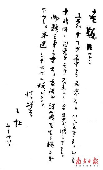 最令人關(guān)注的是,展覽中還展出了魯迅寫于1936年10月18日凌晨的絕筆信(復(fù)制品),這封信寫給好友內(nèi)山完造,讓內(nèi)山幫忙請醫(yī)生前來診治。信中用日文寫道:“老板幾下:沒想到半夜又喘起來。因此,十點鐘的約會去不成了,很抱歉。拜托你給須藤先生掛個電話,請他速來看一下。草草頓首L拜 十月十八日。”記者看到,信上字跡很難分辨,筆力不深、草草書寫,可以想見當(dāng)時魯迅身體已極度虛弱。寫完這封信的次日,魯迅先生就與世長辭了。