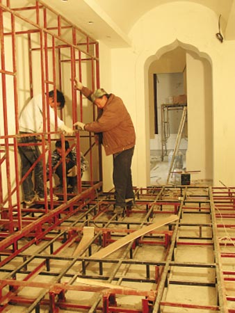走進(jìn)展覽大廳,正中間就是出土于南京大報(bào)恩寺遺址名揚(yáng)四海的七寶鎏金阿育王塔的主展區(qū),設(shè)計(jì)師用“天圓地方”來(lái)形容他對(duì)核心之處的設(shè)計(jì)理念。崇圣殿的大廳內(nèi)從地面到屋頂估計(jì)有9米高,記者看見(jiàn)施工單位搭起了3層高的腳手架,幾名工人正在為圓頂上色,“圓頂共制作了三圈,最大的一圈直徑2.4米,一圈比一圈縮小,這樣可以體現(xiàn)出一種神秘的層次感。18幅飛天壁畫(huà)盤旋在圓頂周邊,最高一圈內(nèi)畫(huà)上藍(lán)色的夜空,然后安裝LD最新燈光系統(tǒng),16盞射燈對(duì)應(yīng)的地方是方形的仿漢白玉基座,座上四邊是進(jìn)口的鋼制廊桿!庇浾咦铌P(guān)心的是基座上究竟陳列什么文物?無(wú)疑是大家都想要看到的,美麗無(wú)比的七寶鎏金阿育王塔。