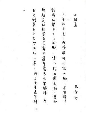 這兩個(gè)月我一直在忙著寫長(zhǎng)篇小說《小團(tuán)圓》,從前的稿子完全不能用,F(xiàn)在寫了一半。這篇沒有礙語。…… 我在《小團(tuán)圓》里講到自己也很不客氣,這種地方總是自己來揭發(fā)的好。當(dāng)然也并不是否定自己。