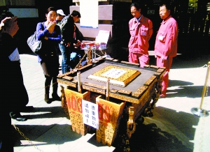 昨天中午,記者看到一只編號為0350的奧運(yùn)缶擺在該小區(qū)門前,其四周用鎖鏈與地面連接,缶上貼著“貴重物品,請勿觸摸”的紙條。旁邊坐著兩名自稱是中國金銀幣禮品網(wǎng)員工的女孩。據(jù)她們介紹,所賣的缶都是奧運(yùn)會開幕式上用過的,完好無損,均由單位以每個10萬元左右的價格從官方拍得,除部分?jǐn)[在分公司展示外,剩下六七只準(zhǔn)備售賣,現(xiàn)在明碼標(biāo)價賣12.8萬!懊恐惑径加惺詹刈C書和電子身份證書,可以上網(wǎng)核查真?zhèn)。擺在這里的是供展示,如果市民有興趣,可以留下手機(jī)號!辟u缶人員說。