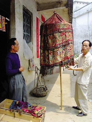 采訪中,李初愛老伯常提起祖先留傳下來的官傘,原來,這傘是冷坑李氏一族的“傳家寶”。李初愛小心翼翼地從房間里的一口木箱中取出折疊好的兩頂官傘,記者見到,木箱底中墊放有鞭炮!斑@可以驅(qū)蟲防潮,”李初愛解釋說,“村中遇有大喜事,才啟用這兩頂官傘!