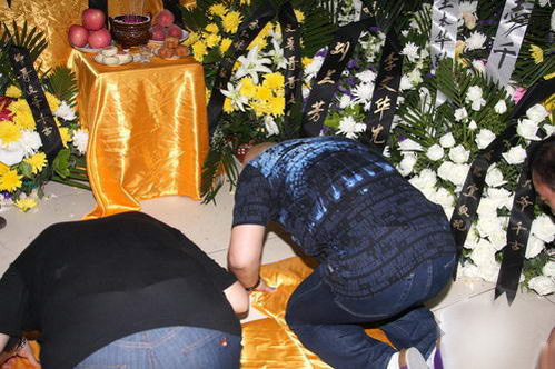 前晚剛結束人民大會堂演出的郭德綱和于謙,昨日趕到李文華的靈堂進行吊唁,并在李文華的遺像前跪拜。