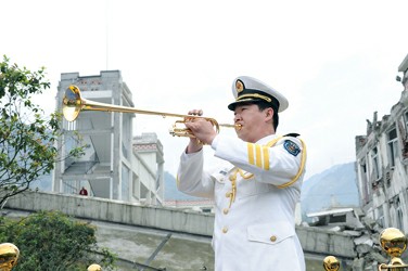 昨天下午,當(dāng)中央領(lǐng)導(dǎo)同志和各界人士在汶川映秀鎮(zhèn)的地震記事墻前獻(xiàn)花時(shí),小號(hào)聲聲相伴,旋律飄揚(yáng)空中,音樂深情感人。記者經(jīng)過曲折采訪,了解到這首《思念曲》的作曲是中國(guó)人民解放軍軍樂團(tuán)青年作曲家郭思達(dá),演奏者是該團(tuán)樂手王強(qiáng)。
