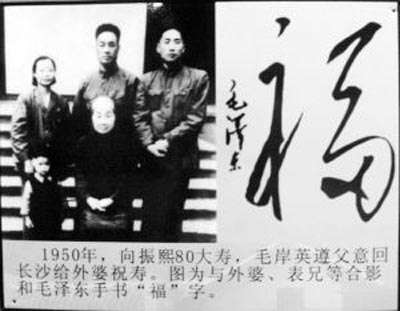 1950年,向振熙80大壽,毛岸英遵父意回長沙給外婆祝壽。圖為其與外婆、表兄等合影和毛澤東手書“!弊帧
