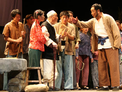 2005年9月6日至8日,由中國文聯(lián)主辦的紀(jì)念中國人民抗日戰(zhàn)爭暨世界反法西斯戰(zhàn)爭勝利60周年優(yōu)秀劇目展演抗戰(zhàn)獨(dú)幕劇專場在中央戲劇學(xué)院實(shí)驗(yàn)劇場上演。91歲高齡的山尊老不僅擔(dān)任專場演出的總策劃,還在《求雨》中扮演一個(gè)回族老人宋大爺,這個(gè)形象設(shè)計(jì)是為了表現(xiàn)全國各族人民團(tuán)結(jié)一致抗戰(zhàn)的決心。由于老人家年事已高,而在劇中還有一個(gè)磕頭的場面,因此在人物設(shè)計(jì)上,將由一個(gè)“小孫女”攙扶上場。當(dāng)大家關(guān)心他是否一定要出演這個(gè)動(dòng)作時(shí),老人說:“磕頭這個(gè)場面我一定要演,而且可以演,但是在起身的時(shí)候,可能要人扶一把!彼木礃I(yè)精神感動(dòng)了所有年輕的演員。本報(bào)組織員工專門到劇場觀看了這場演出,山尊老對藝術(shù)的執(zhí)著精神和要牢記歷史、珍愛和平的諄諄教導(dǎo)讓大家非常感動(dòng)。演出結(jié)束后,報(bào)社向山尊老敬獻(xiàn)了花籃,祝福老人家健康長壽、藝術(shù)生命長青。山尊老欣然與大家合影留念,并高興地說,謝謝報(bào)社對我的關(guān)心,謝謝你們!