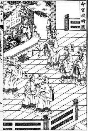 制定歷法,就是“觀象授時(shí)”,對(duì)統(tǒng)治者來(lái)說(shuō)是最重要的事情。天文歷法象征著帝王“君權(quán)神授”的統(tǒng)治權(quán)威。傳說(shuō)堯帝就命天文學(xué)家羲、和二氏進(jìn)行天文觀測(cè)以制定歷法!渡袝虻洹氛f(shuō):“乃命羲和,欽若昊天,歷象日月星辰。”當(dāng)時(shí)是以觀測(cè)日出方位和黃昏時(shí)中天的恒星來(lái)確定季節(jié)。根據(jù)書中記錄的“中星”天象,可以推斷堯帝“觀象授時(shí)”的年代約在公元前23世紀(jì)。當(dāng)時(shí)制定的歷法是一年有366天,以置閏月的方法保持與季節(jié)同步。
