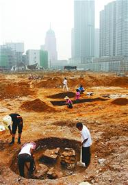 由于天氣炎熱,工作人員揮汗如雨,緊張而細致地進行著發(fā)掘?脊殴ぷ鞯奶厥庑,決定了考古人員在發(fā)掘中只能暴露在烈日下。更麻煩的是濟南最近下雨頻繁,雨后 的工地一片泥沼。要先把淤泥清理干凈,才能繼續(xù)發(fā)掘,而清理淤泥是一件更累人的活。這兩種天氣恰恰都讓此次考古發(fā)掘趕上了,但就是這樣,考古人員卻毫無怨 言,依然兢兢業(yè)業(yè)地工作著。