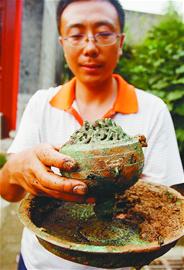 就在記者將要發(fā)稿時,考古工地又傳來消息,在8月9日最新發(fā)掘的一座漢墓中,出土了幾件重量級文物:1件銅薰爐、1件鐵鼎和5個陶罐,另外在腐爛的棺木下面 還發(fā)現鋪有一層漢代五銖錢,其中最為珍貴的是銅薰爐。銅薰爐分為上下兩部分,上為薰爐,鏤空,有花紋;下為一圓形銅盤,直徑大約有30厘米,薰爐與銅盤可 以對插,連接后成為完整的銅薰爐,高度約為20厘米。