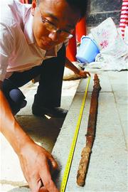 這次出土的幾件鐵器也引起了李銘的興趣。他告訴記者,別小看了這些鐵器,在漢代,這樣的鐵器屬于高檔品,不是一般人能用 的,更不是一般人能享受這樣的陪葬品的。這次出土的鐵器最重要的有3件。第一件是一柄鐵劍,已經斷裂為5截,經拼接后測量,其長大約1.15米。雖然劍體 銹蝕嚴重,但依然能看出質地優(yōu)良,制作講究。劍柄的造型還基本清晰,劍箍為青銅制作。從這柄劍上,我們可以推斷很多當時的情況,如劍長1.15米,比現在 一般的劍要長,這就說明使用這柄劍的人身材比較高大;根據劍的形制,可初步認定是濟南當地制作,如果通過科技手段研究出劍的鐵質及其他合金含量,這對研究 漢代時期濟南地區(qū)的冶煉史有重要的參考價值。再說鐵鼎和鐵釜,它們都是漢代時期的生活用具。其中,鐵鼎為雙耳三足折腹鼎,形狀很好。雖然現在看銹蝕嚴重, 但在當時不是一般人家能夠使用的,不是官員,至少也是大戶人家,所以這對研究當時的社會生活和陪葬習俗都有重要價值。