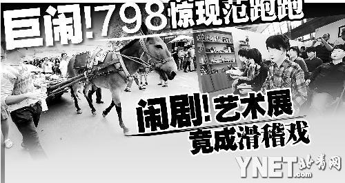 太多的意外使首屆798雙年展更像是一臺鬧劇,可諷刺的是,這些“節(jié)目”使雙年展比一般藝術雙年展、三年展賺得了更多的眼球。而在雙年展主展場內,記者發(fā)現一改眾多展覽的模樣,架上繪畫已經成為展場中的稀有品種,包括搭臺唱戲、流動藥房、村委會議,各種裝置作品以出人意料的方式“藝術”著,從范跑跑開始,那些不甘寂寞的參展藝術家似乎都深諳眼球效應的道理,可觀眾的質疑是:難道作秀已比藝術更重要?