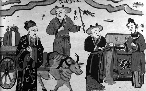 三國時期的曹丕在《燕歌行》中也說:“星漢兩流夜未央,牽牛織女遙相望,爾獨何辜限河梁?”都表明了他們是一對長期被天河所阻隔的戀人。故事的最終完善,是在魏晉南北朝時期。如古本《荊楚歲時記》中記載:天河之東有織女,天帝之孫也,年年機杼勞役,織成云錦天衣,容貌不暇整。帝憐其獨處,許嫁河西牽牛郎。嫁后遂廢織紝。天帝怒,責令歸河東,許一年一度相會。故事中織女的身份、牛郎和織女的關系,他們的結合、分離與最終的命運等要點都已經具備了。唐朝韓鄂在《歲華紀麗》中所引的《風俗通》中所說:“織女七夕當渡河,使鵲為橋。相傳七日鵲首無故皆髡,因以梁渡織女故也!彼侮愒n《歲時廣記》所引《淮南子》中也說:“烏鵲填河成橋渡織女!逼渲,牛郎、織女于七夕鵲橋相會的情節(jié)已清晰可見。越往后來,由這種美麗而神秘的天象引發(fā)出的愛情故事越來越完善,也越來越吸引人:織女是玉皇大帝的孫女,她用一種神奇的絲在織布機上織出層層疊疊美麗的云彩,隨著時間和季節(jié)不同而變幻云彩的顏色。在紡織之余,織女經常和天上的仙女們在銀河中沐浴。牛郎則是凡間下界的一個貧困孤兒,還常常受哥嫂的虐待。后來,狠心的哥嫂分與一頭老牛讓他自立門戶,牛郎在貧困中與老牛相依為命,對老牛悉心照料。有一天,老牛突然開口說話了,它對牛郎說:“牛郎,今天你去碧蓮池一趟,那兒有些仙女在洗澡,你把那件紅色的仙衣藏起來,穿紅仙衣的仙女就會成為你的妻子!迸@梢娎吓?谕氯搜裕制婀钟指吲d。牛郎按照老牛的吩咐,悄悄躲在碧蓮池旁的蘆葦里,等候仙女們的來臨。不一會兒,仙女們果然翩翩飄至,脫下輕羅衣裳,縱身躍入清流。牛郎便按照老牛的囑咐,到河邊拿走了一件紅色的衣服,驚慌失措的仙女們急忙穿好衣服飛走了,只剩下了無衣可穿、無法飛走的織女。在牛郎的懇求下,織女答應做他的妻子;楹,夫妻二人男耕女織,相親相愛、美滿幸福地一起生活了許多年,織女還為牛郎生下了一兒一女。再后來,老牛臨死的時候,囑咐牛郎要把它的皮留下來,到危難時可以得到幫助?椗团@伤阶猿捎H的事,終于被天庭中的玉帝知道了,他憤怒地派遣天神到下界來抓走了織女。牛郎無法追趕,忽然想起老牛臨終的囑咐,急忙找出牛皮披在身上,挑了兩個孩子追上天去。眼看,牛郎就要追上織女了。可就在這時,王母娘娘拔下頭上的金簪,往他們中間一劃,霎時間,一條天河波濤滾滾地橫在了織女和牛郎之間,無法橫越了;氐教焱ブ械目椗,終日以淚洗面,思念自己的丈夫和孩子;牛郎也思念自己的妻子,日復一日地帶著孩子在天河邊上翹首盼望。他們的真摯感情,終于感動了玉皇大帝和王母娘娘,但也只是恩準他們在每年的七月七日這天相會一次。天河上沒有橋,為了幫助他們相會,人世間所有喜鵲就飛上天去,為牛郎織女在天河上搭起了一座橋,讓他們在橋上相會。據說,每逢一年的七月七日,大地上就根本見不到喜鵲,原因是它們都飛到天河上搭橋去了。