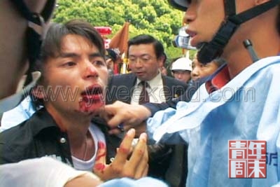 靖國神社內(nèi),眾人向神社行禮參拜,突然,一個學(xué)生模樣的年輕人沖到前面高呼“反對參拜靖國神社!”他很快被撲倒在地,雙方扭打在一起。終于有人竭力拉開了他們,又有一位老者上前,緊逼著他走了很遠(yuǎn),并不住呵斥:“滾回中國去!滾回中國去!”年輕人一言不發(fā),但這長達(dá)幾分鐘的反復(fù)呵斥令這些中國觀眾有些難以忍受。一直用攝像機記錄這一過程的李纓當(dāng)時也急切地想驗明這個年輕人的身份,于是,在旁邊所有人都把這個反對參拜靖國神社的年輕人當(dāng)作中國人的時候,李纓小心翼翼地問了一句:“是中國人嗎?”“不,我是日本人!